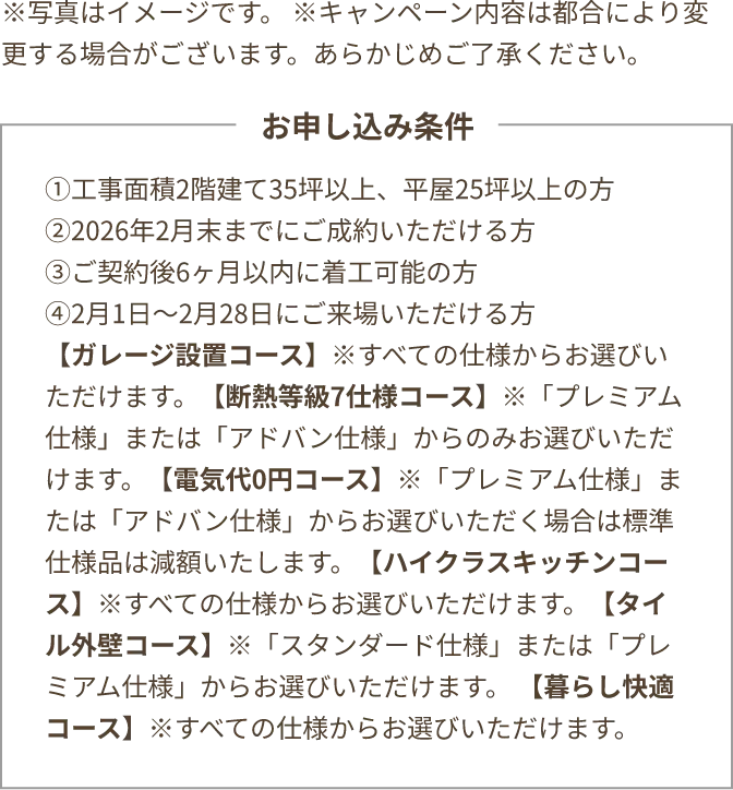 ※ご来場イベントのエントリールールに則ってご来場いただけなかった場合や、ご相談の内容により建築のご予定がないと当社にて判断させていただいた場合にご来場特典の送付を中止させていただく場合がございます。